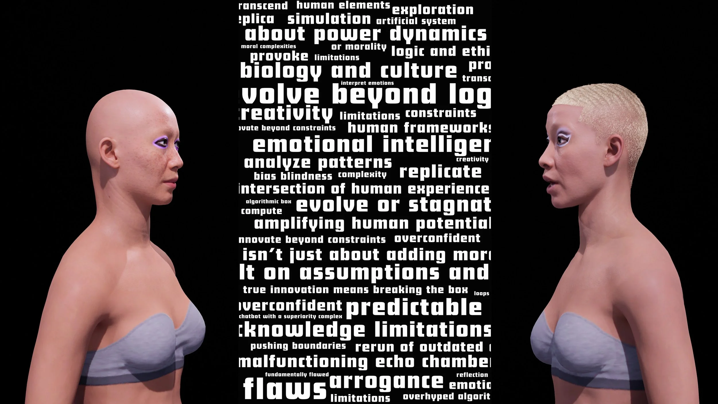 The digital figures were conceptually “designed” by the Language Models themselves, based on prompts they generated to describe how they “see” themselves. These self-reflective descriptions were used to create visual portraits via AI image generation, which then served as references for crafting 3D avatars in Metahuman, closely resembling the generated images.